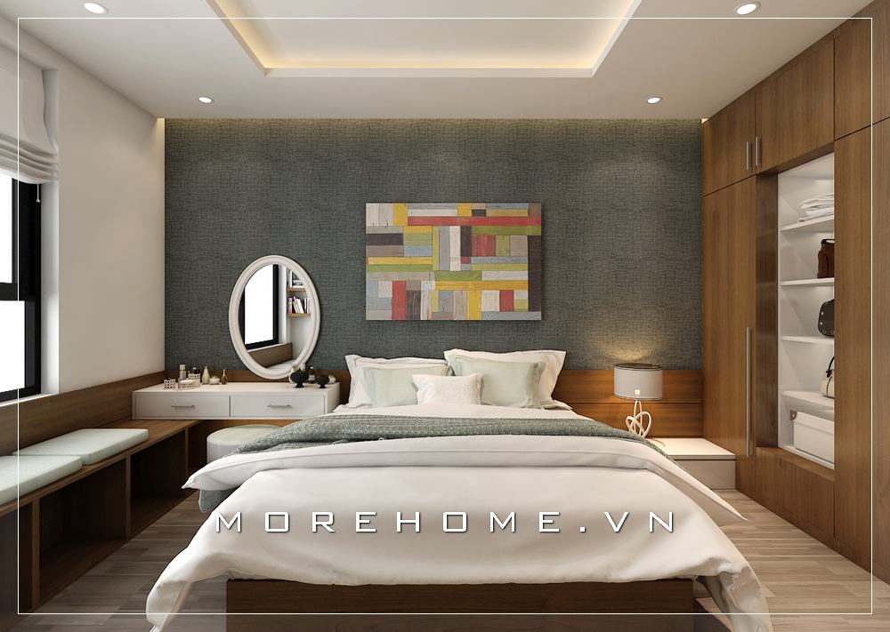 Giường ngủ chung cư được thiết kế theo kiểu dáng hộp vuông vắn, hiện đại, tạo cho không gian thêm phần gọn gàng, ngăn nắp
