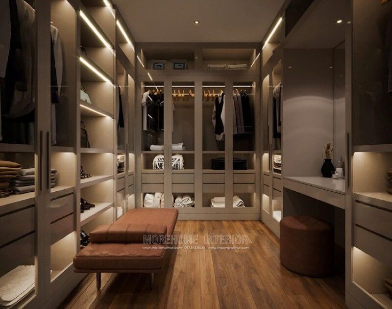 Tủ quần áo màu trắng sử dụng hệ cửa kính trắng cường lực sẽ giúp bạn tìm thấy mọi thứ một cách dễ dàng
