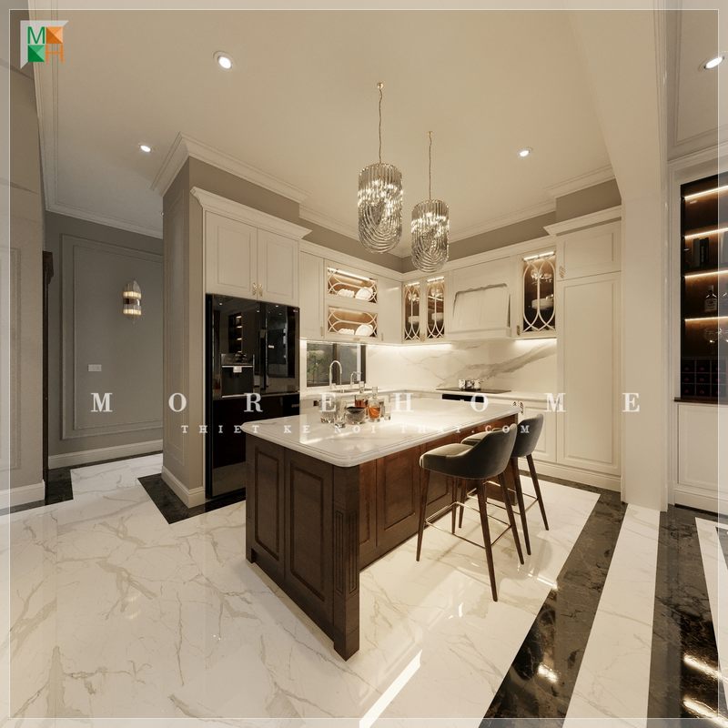 Phòng bếp biệt thự được thiết kế theo phong cách hiện đại, tiện nghi và sang trọng.