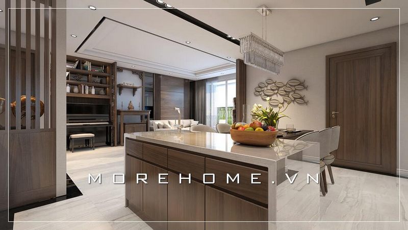Bàn đảo bếp mặt đá làm nên sự tinh tế, sang trọng và tiện nghi khi người dân đến vào căn phòng.