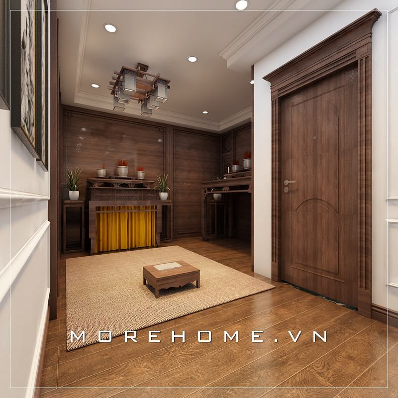 Mẫu bàn thờ tổ tiên hiện đại có tủ thờ bên dưới với bánh xe giúp cho chủ nhà dễ dàng di chuyển và bày trí đồ cúng thuận tiện.