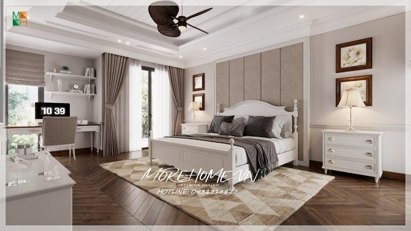 Không gian phòng ngủ con trong biệt thự phong cách tân cổ điển được thiết kế bằng tông màu trắng kết hợp với màu be và xám giúp tạo nên một không gian đơn giản, trẻ trung và nhẹ nhàng.